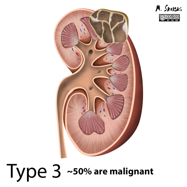 Statistika liecina, ka aptuveni 50% gadījumu šie veidojumi ir ļaundabīgi (cistiska nieru šūnu karcinoma), taču bieži tie ir zemas agresivitātes audzēji. Tādēļ ārstēšanas taktika nav viennozīmīga – tā ir atkarīga no vairākiem individuāliem faktoriem un gala lēmums parasti tiek pieņemts multidisciplinārā konsīlijā.