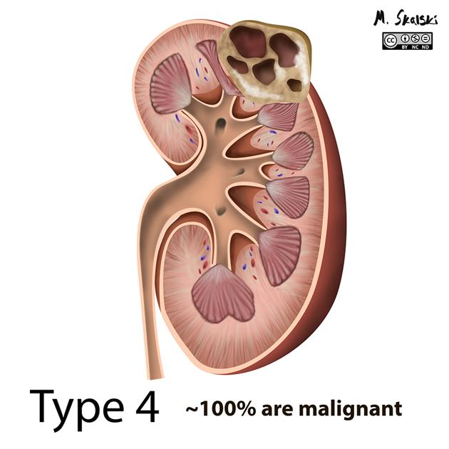 Šādas nieres cistas gadījumā gandrīz vienmēr rekomendēta ķirurģiska ārstēšana (nefrektomija vai nieres rezekcija), jo risks, ka tas ir nieru vēzis, ir ļoti augsts.